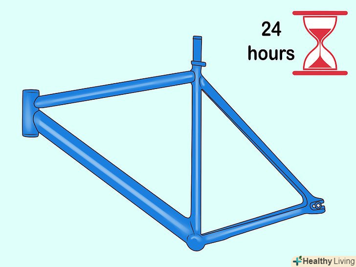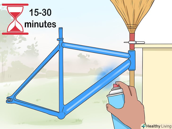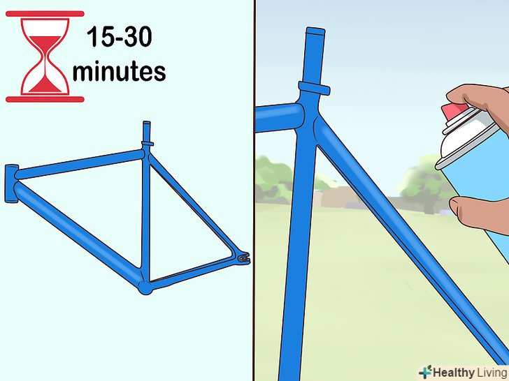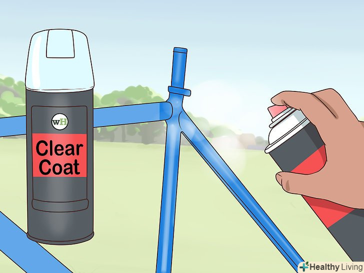 Щоб захистити велосипед від іржі і надати йому додатковий блиск, покрийте раму шаром лаку.пофарбувавши раму аерозольною фарбою, потрібно почекати кілька годин, перш ніж покривати її лаком. Як тільки фарба повністю висохне, нанесіть на раму рівномірний шар аерозольного лаку аналогічно тому, як ви працювали з фарбою.[17]- Щоб досягти найкращих результатів, нанесіть три шари лаку. Після кожного чергового шару вичікуйте по 15-30 хвилин, перш ніж перейти до наступного.
