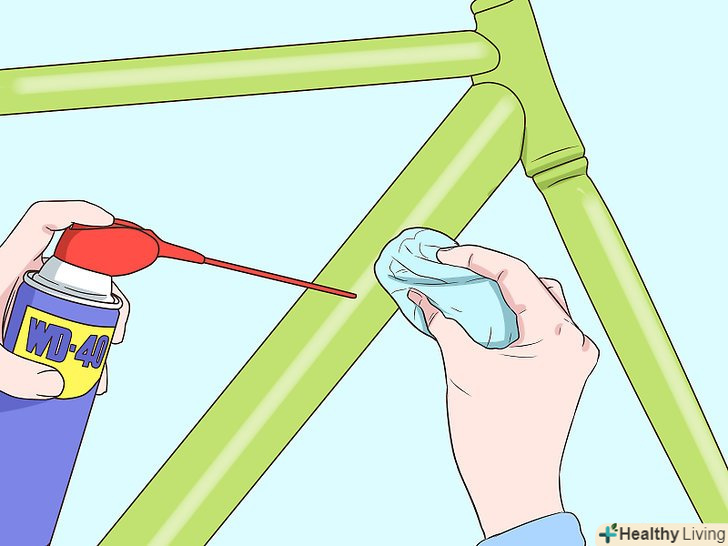 Протріть раму велосипеда засобом WD-40, перш ніж зачищати її наждачним папером.якщо на рамі присутні залишкові сліди клею від наклейок, розпорошите на неї WD-40, а потім протріть ганчіркою.[4]
