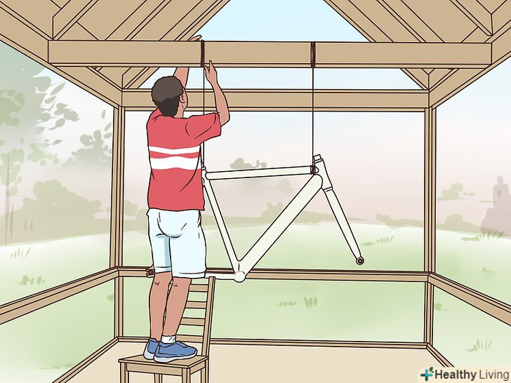 Якщо у вага немає можливості підвісити раму, закріпіть її на робочій поверхні.Просуньте дерев'яний держак (наприклад, від мітли) через передню трубу рами і зафіксуйте його лещатами на робочому столі, щоб рама виявилася закріпленою у вертикальному положенні поруч зі столом.[10]- Якщо у вас немає столу, закріпіть раму на робочій поверхні, стенді або іншої конструкції, яка дозволить підняти раму над землею.