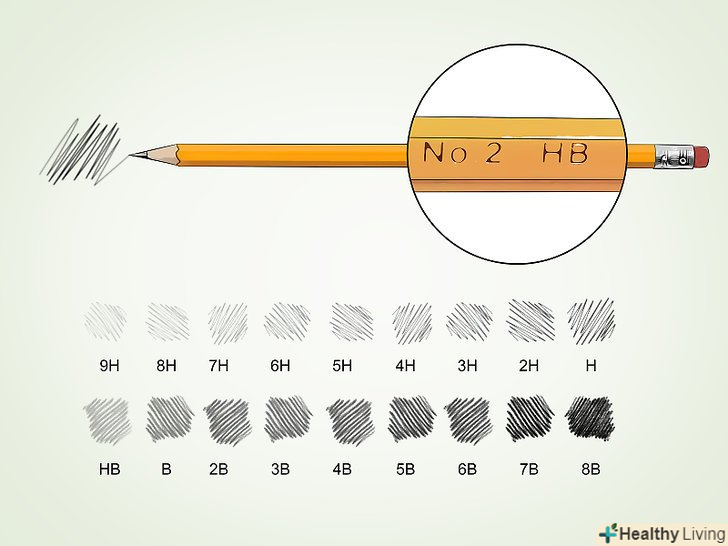 Почніть працювати з додатковими матеріалами. зазвичай краще користуватися чимось одним до того, як ви накопичите досвід, наприклад, олівцем і папером. Потім же можна підшукати альтернативи, які вам більше сподобаються і допоможуть виробити власний стиль, наприклад, почати працювати з кольоровими олівцями або з вугіллям. Крім того, навіть прості олівці бувають різної твердості, що дозволяє розширити можливості в накладанні тіней. [7] Почніть працювати з додатковими матеріалами. зазвичай краще користуватися чимось одним до того, як ви накопичите досвід, наприклад, олівцем і папером. Потім же можна підшукати альтернативи, які вам більше сподобаються і допоможуть виробити власний стиль, наприклад, почати працювати з кольоровими олівцями або з вугіллям. Крім того, навіть прості олівці бувають різної твердості, що дозволяє розширити можливості в накладанні тіней. [7]- Стандартними вважаються олівці ТМ (HB). Олівці Т-категорій (Н) більш тверді і підходять для малювання світлих ліній. Олівці М-категорій (B) м'якше і підходять для малювання більш темних ліній.