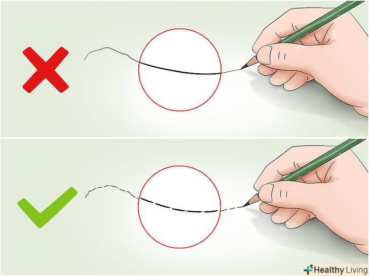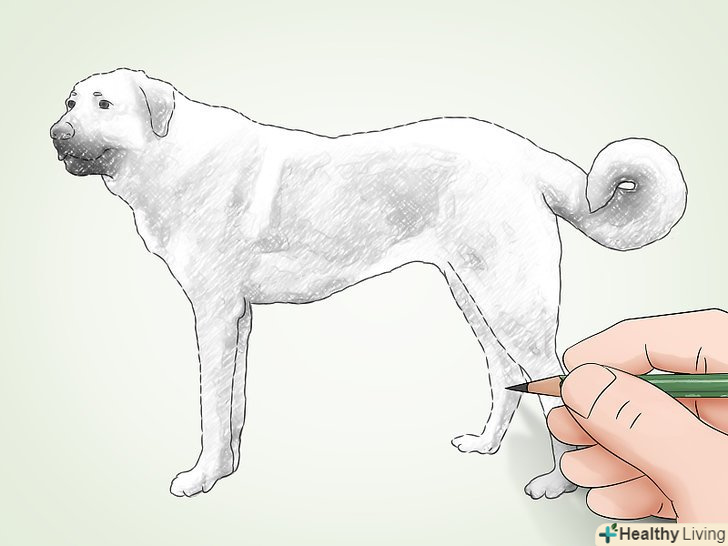 Намалюйте загальний начерк короткими штрихами. легко натискайте олівцем на папір. Концентруйтеся на тій лінії, яку малюєте, забувши про сам об'єкт. Якщо ви малюєте собаку, забудьте про неї. Замість цього почніть креслити її контури. Вони являють собою межі між тілом собаки і навколишнім оточенням. Накресліть ці контури короткими штрихами. [1] Намалюйте загальний начерк короткими штрихами. легко натискайте олівцем на папір. Концентруйтеся на тій лінії, яку малюєте, забувши про сам об'єкт. Якщо ви малюєте собаку, забудьте про неї. Замість цього почніть креслити її контури. Вони являють собою межі між тілом собаки і навколишнім оточенням. Накресліть ці контури короткими штрихами. [1]- Чим коротше будуть ваші штрихи, тим більш акуратним вийде начерк.