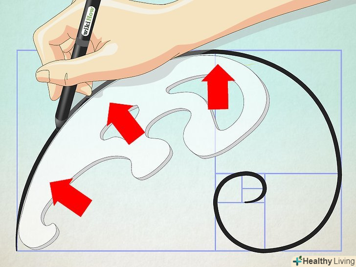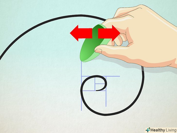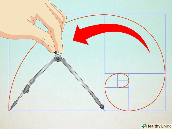 Змініть розмах циркуля. виставте розмах, що становить дві одиниці довжини. Знову поверніть циркуль на 90 градусів проти годинникової стрілки. Потім, послідовно виставляючи розмах циркуля в 3, 5, 8 і т.д. одиниць, продовжуйте обертати його до тих пір, поки спіраль не пройде через всі квадрати. Змініть розмах циркуля. виставте розмах, що становить дві одиниці довжини. Знову поверніть циркуль на 90 градусів проти годинникової стрілки. Потім, послідовно виставляючи розмах циркуля в 3, 5, 8 і т.д. одиниць, продовжуйте обертати його до тих пір, поки спіраль не пройде через всі квадрати.
