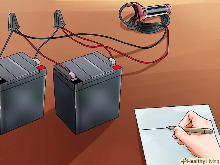 Знайдіть акумулятори.перш ніж почати купувати інші запчастини, Ви повинні знати, яку напругу видають ваші акумулятори. Найпоширеніше напруга для електровелосипедів-24 вольта або 36 вольт. Ви можете підняти цей показник, але деталі будуть коштувати дорожче, і знайти їх буде важче. Найпростіше купити дешеві свинцево-кислотні акумулятори, які часто використовуються в джерелах безперебійного живлення (ДБЖ). У таких акумуляторах використовується напруга в 12 вольт, і вони видають від 7 до 12 ампер-годину (а*год) потужності. Автомобільні акумулятори не підійдуть! По-перше, якщо такий акумулятор перевернеться, з нього може витекти кислота. Крім того, вони розраховані для сильних навантажень протягом декількох секунд, а не для слабкого навантаження протягом тривалого часу, тому прослужать вони недовго.