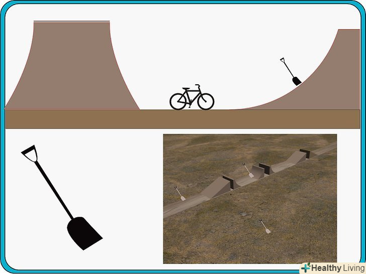 - Зваліть колоди і камені в дві купи, а потім присипте їх землею, висота Куп і відстань між ними залежать від вашого досвіду катання дл новачків трампліни слід робити висотою 60-90см, а для експертів можна робити трампліни до 2х метрів заввишки.проліт між трампліном і приземленням повинен бути від 60 до 150 см для новачків і 2-4м для досвідчених райдерів. Виліт повинен мати радіус і закінчуватися під 45 – 75 градусів щодо горизонту.