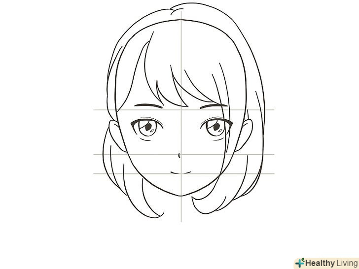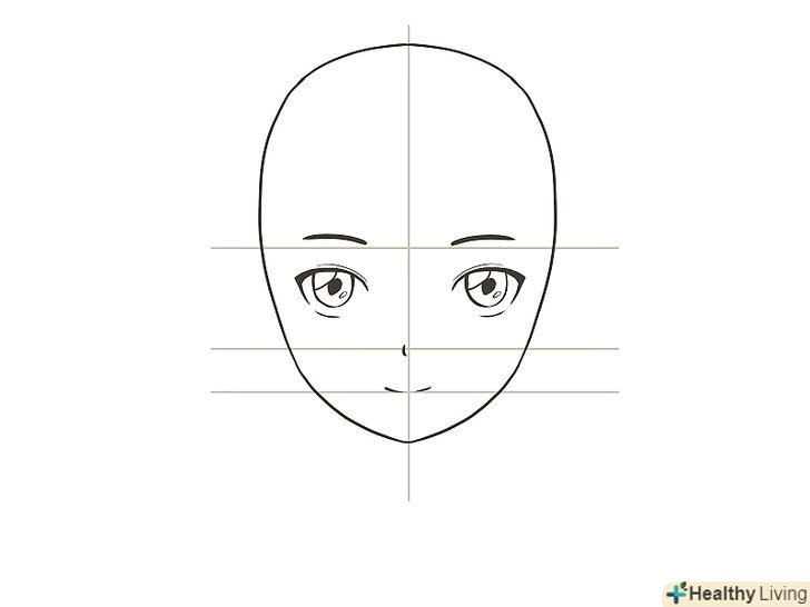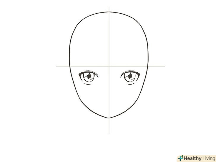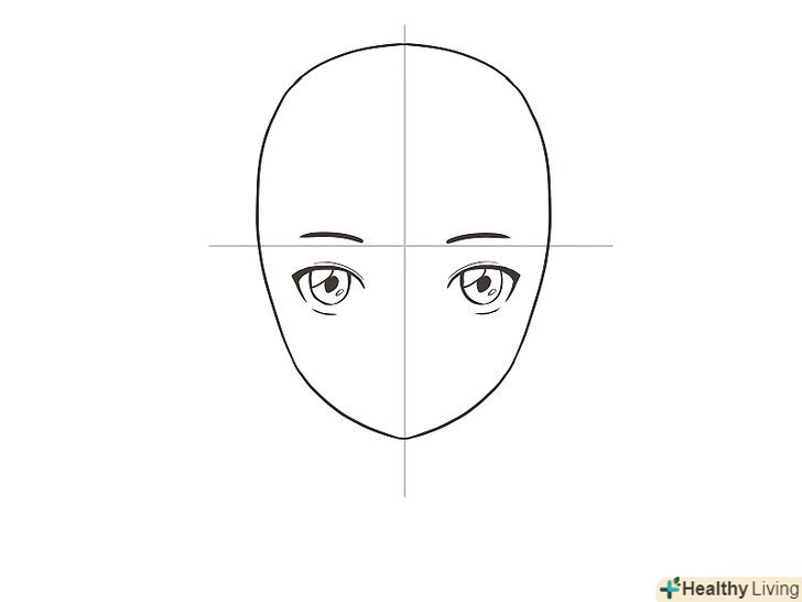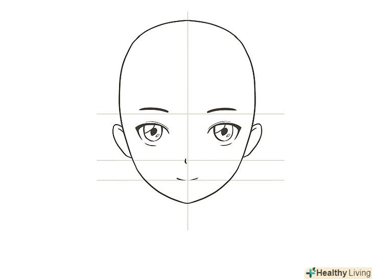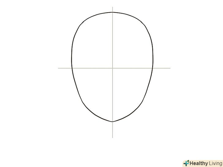 Намалюйте овал і поділіть його на 4 сектора допоміжними лініями. це будуть базові обриси голови персонажа. Пропорції не обов'язково повинні бути точними, але все ж зробіть нижню частину овалу вужчою, так як вона стане підборіддям. Коли овал буде готовий, проведіть через його середину горизонтальну лінію. Потім проведіть посередині вертикальну лінію, щоб вона перетинала при цьому горизонтальну. Далі ви будете використовувати ці лінії в якості орієнтирів для розташування різних рис обличчя вашого персонажа. [1]- Якщо ви хочете, щоб у персонажа було більше обличчя, зробіть низ овалу ширше, щоб він був лише трохи вже верхній частині. Якщо ж вам потрібно зобразити персонажа з вузьким обличчям, зробіть нижню частину овалу ще більш вузькою, ніж верхню. Для зображення персонажів аніме немає уніфікованої форми голови, тому ви можете експериментувати до тих пір, поки не знайдете той варіант, який вам найбільше сподобається.