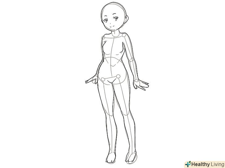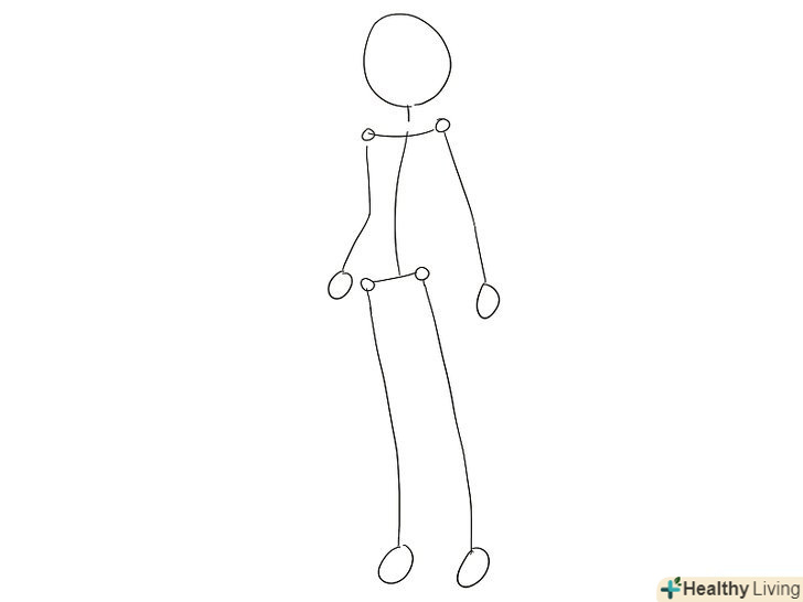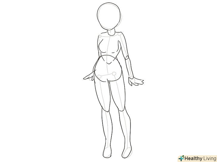 З'єднайте лінії і прорисуйте остаточні контури тіла. обведіть зовнішні контури тіла персонажа безперервною лінією. На цьому етапі вам слід трохи підправити сполучні лінії між різними частинами тіла, щоб вони виглядали більш реалістично. Це стосується рук персонажа , плечей, стегон, ніг і шиї. Коли ви закінчите, у вас вийде більш детальне зображення тіла поверх раніше створеного абстрактного начерку. [9]- Щоб з'єднати і позначити підсумкові лінії ніг, обведіть зовнішні обриси кожної фігури, з якої вони складаються (овалів у верхній і нижній частинах, кіл в області колін і овалів стоп). Вам необхідно створити один нерозривний контур для кожної ноги. Переконайтеся в тому, що контури вийшли плавними і без розривів, щоб ноги виглядали реалістично.