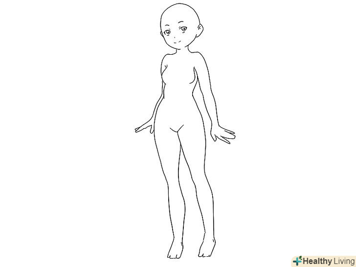 Намалюйте лінійний начерк тіла персонажа. використовуйте прямі лінії для зображення рук, тіла і ніг. Зробіть руки і торс приблизно однаковими по довжині, а ноги — десь на третину довше. Потім позначте кисті рук і стоп овалами або трикутниками. Розмір кистей рук повинен становити приблизно 1/5 від загальної довжини рук, а стопи повинні відповідати приблизно 1/6 довжини ніг. [8]- Щоб пропорції вийшли правильними, тіло персонажа на повний зріст має бути приблизно в 7 разів довше висоти його голови.