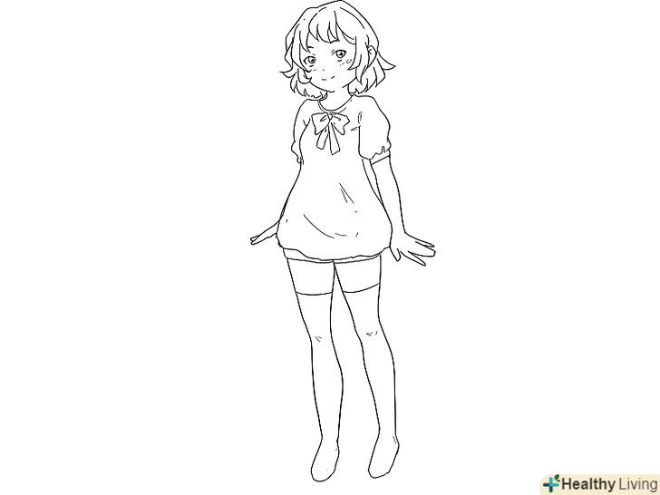 Намалюйте персонажа анімеОдяг . намалюйте одяг поверх контурів тіла. Наприклад, якщо персонаж одягнений в сорочку, намалюйте її рукава поверх рук, а основу — поверх торсу. Потім зітріть контури тіла, які виявляться всередині обрисів одягу, так як вони просто приховані під нею. Наприклад, якщо персонаж одягнений в шорти, зітріть контури верхньої частини ніг, що опинилися всередині контурів шорт, так як під одягом їх не повинно бути видно. [11]- Малюючи одяг, проаналізуйте, в яких місцях вона схильна утворювати складки, коли такий одяг носять люди в реальному житті. Потім відобразіть ці складки на малюнку, щоб одяг виглядав реалістичніше. Можна також докладніше розглянути малюнки одягу з Інтернету, щоб зрозуміти, як на ній зображують складки.