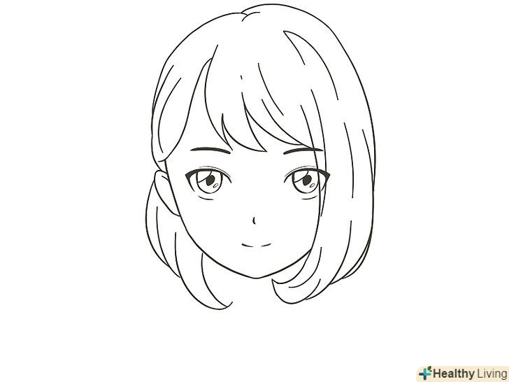 Намалюйте волоссяНа голові персонажа. зачіску ви вільні вибирати самі, але зазвичай в стилі аніме волосся зображують вираженими секціями з загостреними кінцями пасом. Можна зобразити коротку стрижку, волосся середньої довжини або ж довгі хвилясті волосся. Який би варіант зачіски ви не вибрали, намагайтеся при цьому не зображувати індивідуальних пасом. Замість цього малюйте великі секції волосся з 4-5 загостреними кінцями пасом. [7]- Якщо у персонажа довге волосся, з боків голови йому можна намалювати два кінських хвостика з гострими кінцями. Або можна намалювати зібрані в пучок волосся. Як варіант, можна намалювати персонажу чубок, зобразивши 3-4 виражені пасма, що спускаються на лоб.
