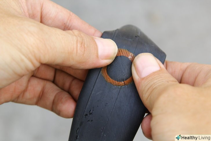 Відірвіть захисну плівку з заплатки.не торкаючись липкої сторони, прикладіть латку цією стороною до камери на місце проколу і міцно притисніть. Однією рукою тримайте камеру, а другою рукою міцно притисніть до камери латку.