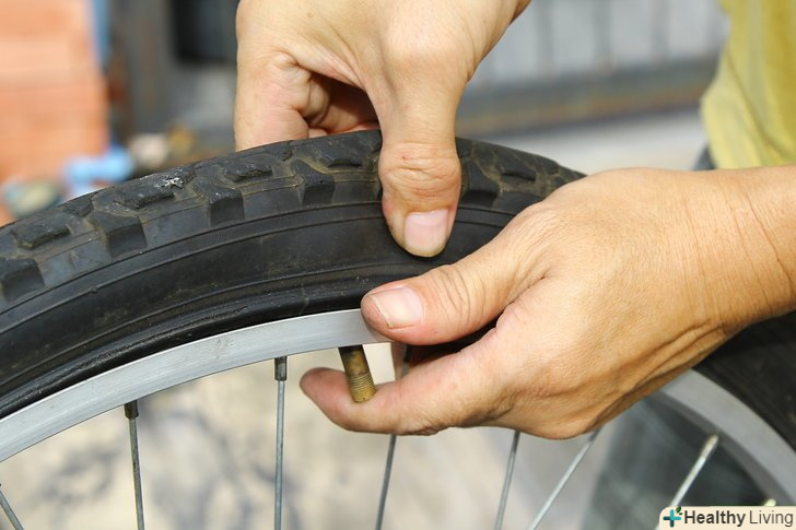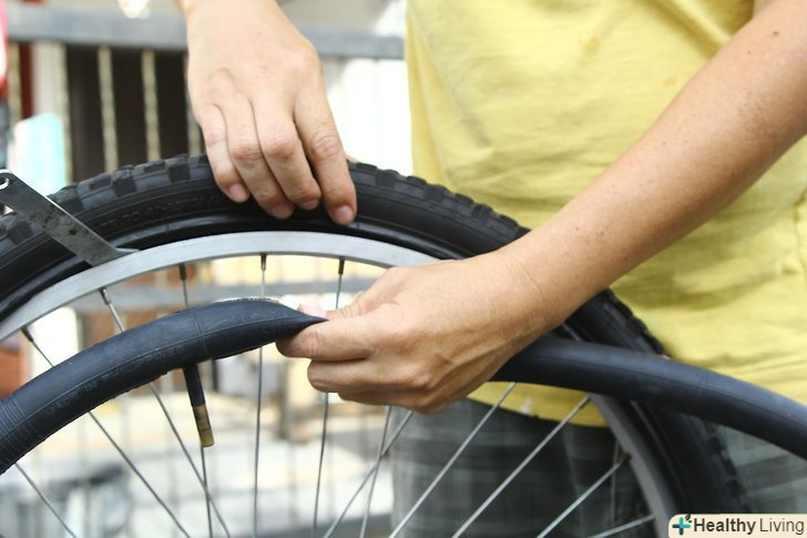 Вставте камеру назад в покришку.починаємо з ніпеля камери-заштовхуємо цю частину камери в покришку і вставляємо ніпель в обід.