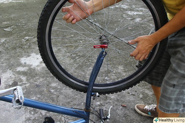Ставимо колесо назад на велосипед.застебніть гальма, якщо ви розстебнули їх, щоб зняти колесо. Якщо це було заднє колесо, заведіть ланцюг на блок зірочок. Перевірте, чи рівно виставлено колесо по відношенню до гальмівних колодок. Затягніть колесо гайками або ексцентриком.