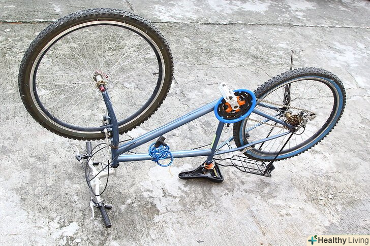 Переверніть велосипед догори ногами, щоб він стояв на кермі і сідлі.переконайтеся, що він не спирається на ручки гальм і перемикачі швидкостей (манетки). Якщо потрібно-підкладіть дерев'яні бруски.