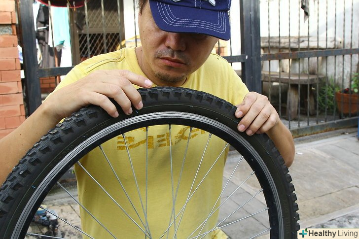 Визначте причину і місце проколу.якщо шина лопнула або в ній утворилася велика діра, її доведеться замінити. Якщо ви проїхалися по колючій гілці, в ній може бути купа дірок, але якщо це один невеликий прокол, наприклад, від цвяха або шипа, ремонт може бути проведений "не відходячи від каси", тобто, не знімаючи колесо з велосипеда.