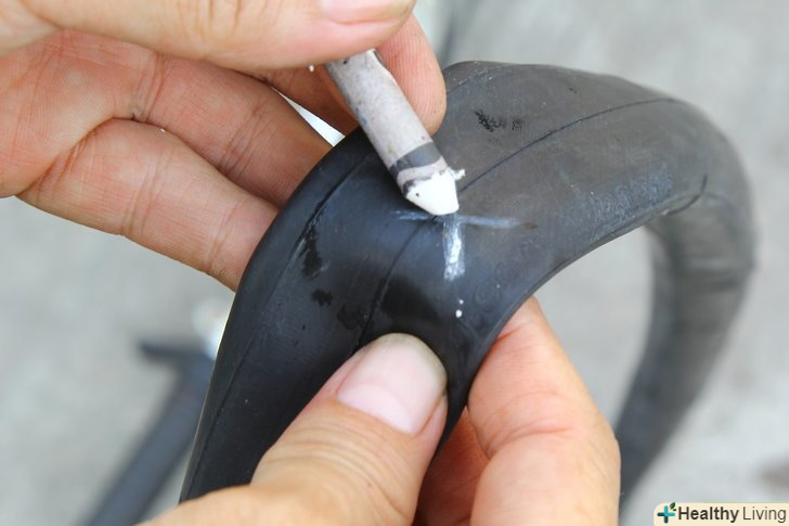 Знайшовши дірку, позначте її.за допомогою кулькової ручки або крейди намалюйте хрестик у знайденої дірки. Інакше вам буде складно визначити, куди клеїти латку. Знову спустіть повітря з камери.
