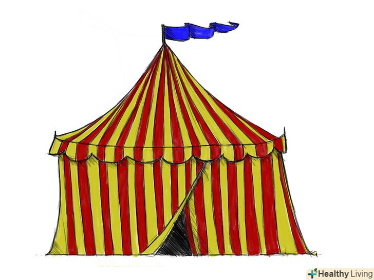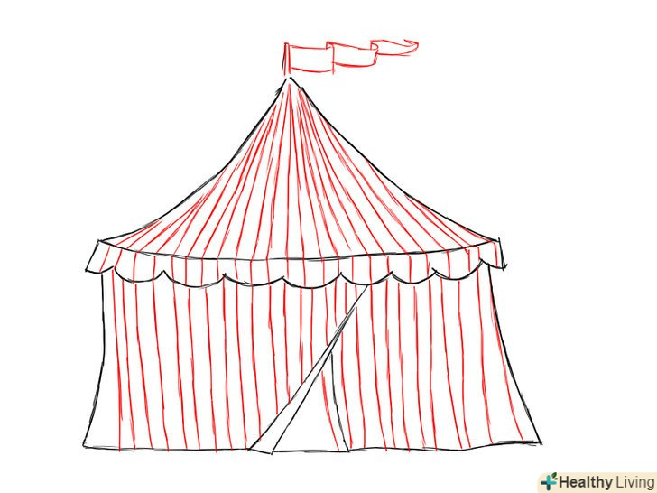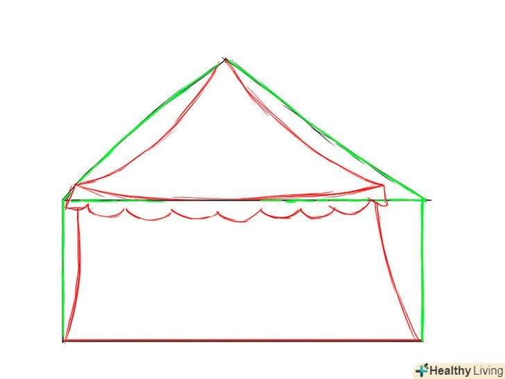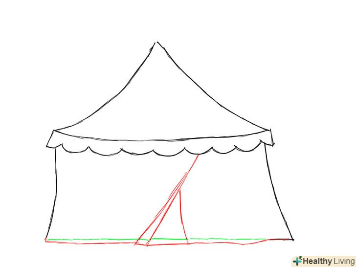 - При творенні конструкції, виготовленої з неміцних матеріалів, важливо вимальовувати впізнавані особливості, щоб ваш малюнок виглядав більш переконливо. В даному випадку, при малюванні тенту з тканини, буде добре зображати його так, як ніби на нього впливає сила тяжіння (згинаються лінії і криві).