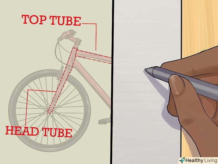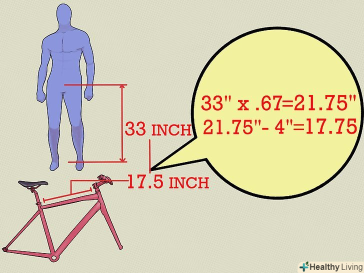 Зробіть виміри, щоб дізнатися розмір рами.Встаньте, розставивши ноги на 15 см один від одного. Заміряйте відстань з внутрішньої сторони від стопи до точки перетину ноги і талії, між промежиною і внутрішньою поверхнею стегна в дюймах. Помножте це число на 0,67 і з отриманого результату відніміть 10-13 см, щоб отримати розрахункову довжину верхньої трубки. [6] якщо можливо, використовуйте виміри верхньої трубки, так як підсідельну трубку у деяких виробників виміряти важко.[7]- Якщо ваш розмір 33 дюйма (83,8 см), вам підійде довжина верхньої трубки 17,5 дюймів (44,5 см):