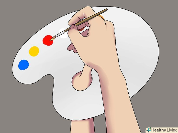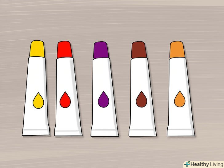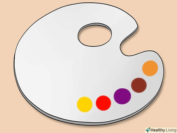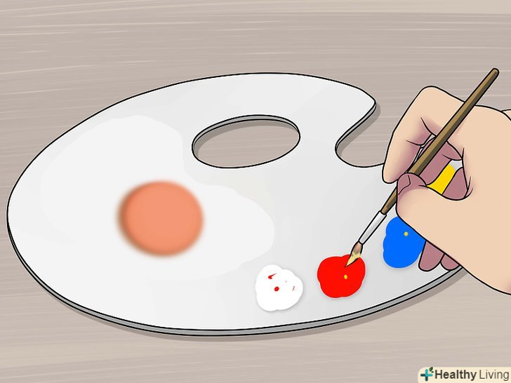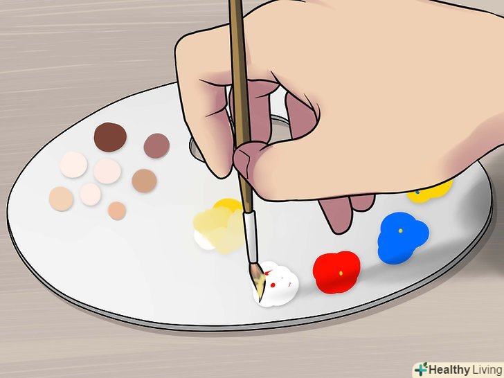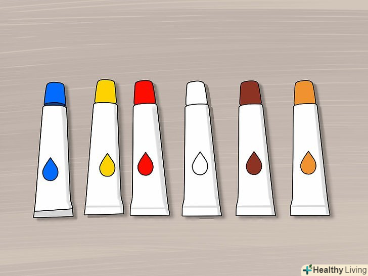 Підберіть фарби тих кольорів, які вам знадобляться. для того щоб домогтися середнього відтінку шкіри, потрібно буде змішати більшу кількість кольорів. Підготуйте фарби наступних кольорів: [4]- Червоний;