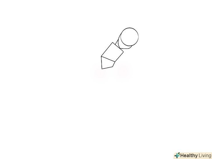 Намалюйте трохи по діагоналі вертикальну лінію в центрі кола, проводячи її в сторону U-подібної фігури. намалюйте дві перпендикулярні лінії, що перетинають цю лінію всередині кола. Ці лінії послужать орієнтиром для малювання очей і інших деталей особи. Далі, намалюйте нерівну квадратну фігуру в правій стороні листа. З'єднайте цей квадрат з головою двома вигнутими лініями. У верхньому кутку квадрата намалюйте коло для одного з плечей. Такий же коло намалюйте в нижньому найбільш близькому до шиї кутку.