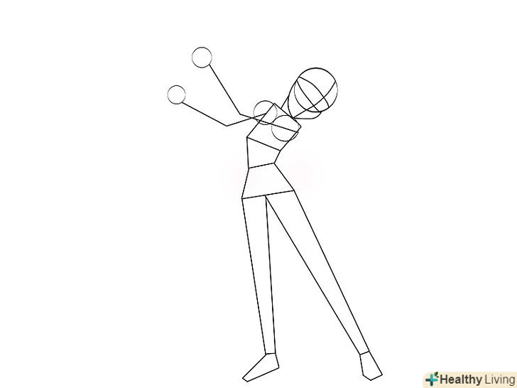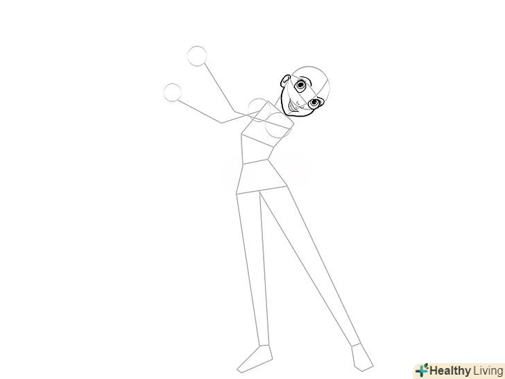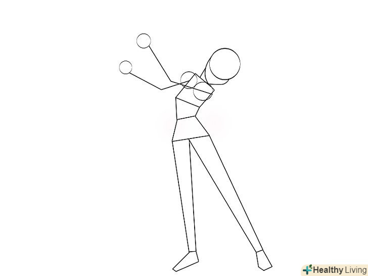 Намалюйте пару кіл у верхній частині тулуба. до кожного кола приєднайте ламані лінії, які послужать орієнтиром для малювання рук. Намалюйте по одному колу на кінці кожної з цих напрямних ліній.