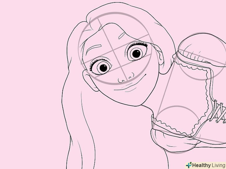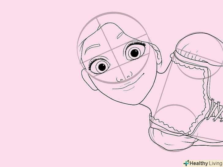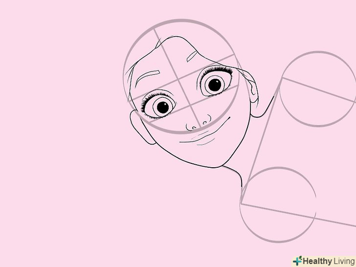 Орієнтуючись по напрямних лініях для особи, намалюйте її веселі, широко розкриті очі; потім брови, ніс, губи і вуха. Також ви можете почати малювати волосся в області чола.