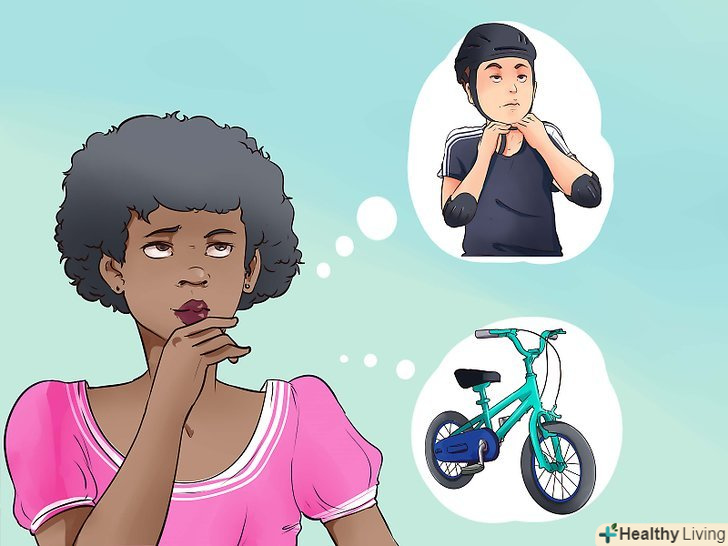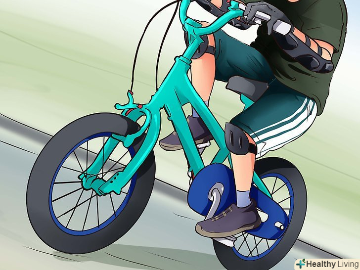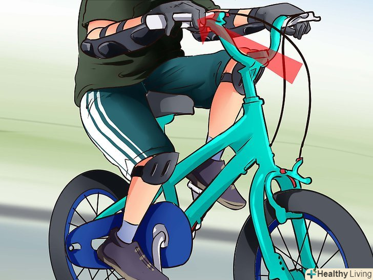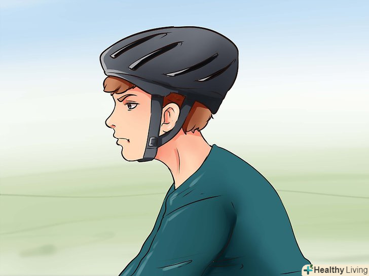 Одягайте шолом і захисне спорядження.ви повинні завжди надягати шолом, коли сідаєте на велосипед, а також можна використовувати і інші частини захисного спорядження! Це знизить страх перед їздою без коліс-стабілізаторів. Оскільки спорядження буде захищати від отримання травм, ви не будете так нервувати від можливого падіння з велосипеда або зіткнення. Ось деякі речі, які рекомендується надягати в перший час катання без коліс-стабілізаторів:- Налокітники