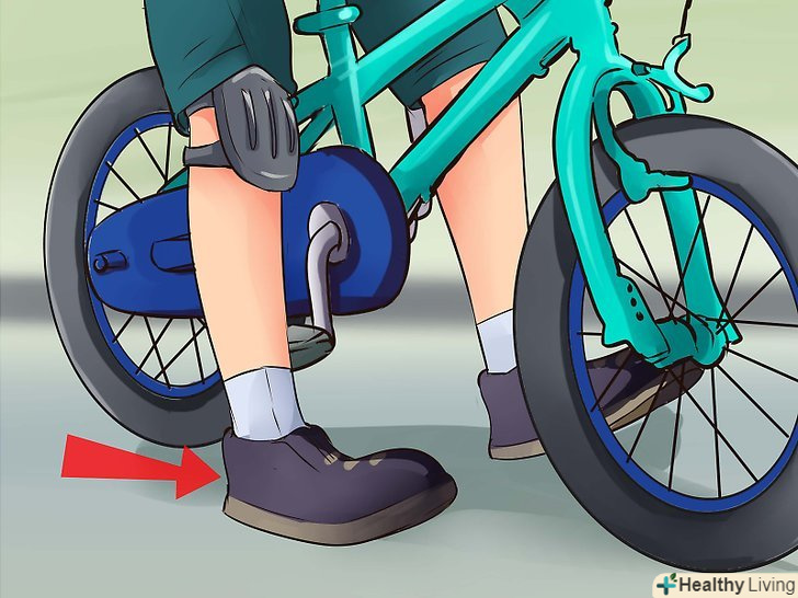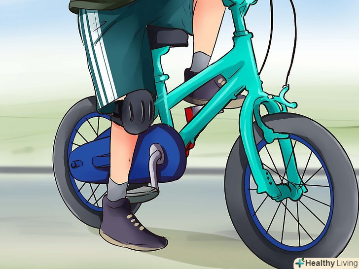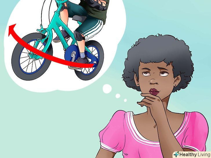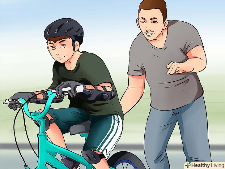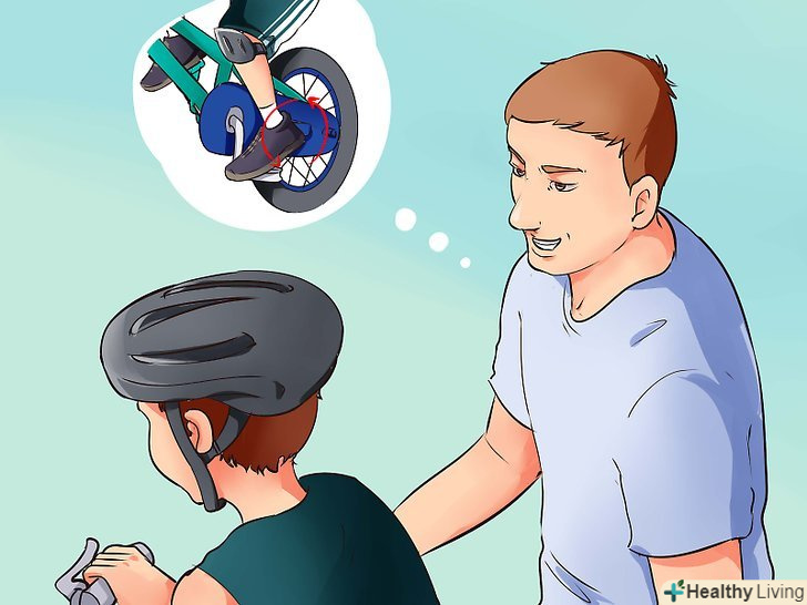 Переконайтеся, що ваша дитина добре захищена і велосипед відповідає його росту.не дозволяйте дитині кататися без шолома. Це не тільки небезпечно, але і може стати дуже поганою звичкою.[1] ви також можете запропонувати дитині надіти додаткове захисне спорядження, таке, як Налокітники і наколінники. Таким чином, діти, які бояться їздити, будуть відчувати себе більш впевнено. Нарешті, переконайтеся, що ваша дитина, сидячи на велосипеді, може дістати ногами землі і, при необхідності, відрегулюйте сидіння.- Зверніть увагу, що в деяких місцях є закони, що зобов'язують велосипедистів до певного віку носити шолом[2] іноді порушення такого закону може розглядатися як правопорушення з боку батьків.