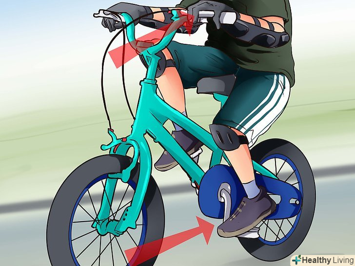Дозвольте дитині використовувати гальма.нехай він робить все, як і раніше, але в цей раз контролює швидкість за допомогою гальм. Коли він спуститься з гірки, скажіть йому зупинитися гальмами. Повторюйте це до тих пір, поки дитина не буде впевнено сповільнюватися і зупинятися без вашої допомоги. Поясніть йому, що при необхідності він завжди зможе зупинити велосипед. Це є одним з найважливіших нюансів у побудові довіри дитини до велосипеда.- Більшість дитячих велосипедів мають ножні гальма, інакше кажучи, дитина повинна прокрутити педалі назад для зупинки. Багато велосипеди для навчання катанню без коліс-стабілізаторів обладнані ножним гальмом. Це зроблено в зв'язку з тим, що на додаток до інших необхідних навичок використання рук може стати для маленьких дітей занадто великим навантаженням.[4] однак, якщо велосипед вашої дитини має ручне гальмо, це не страшно. На такому велосипеді теж можна навчитися, просто буде потрібно трохи більше часу.