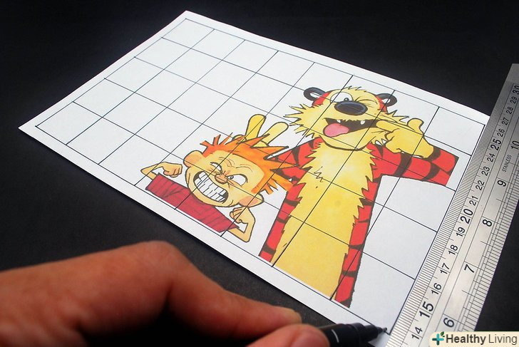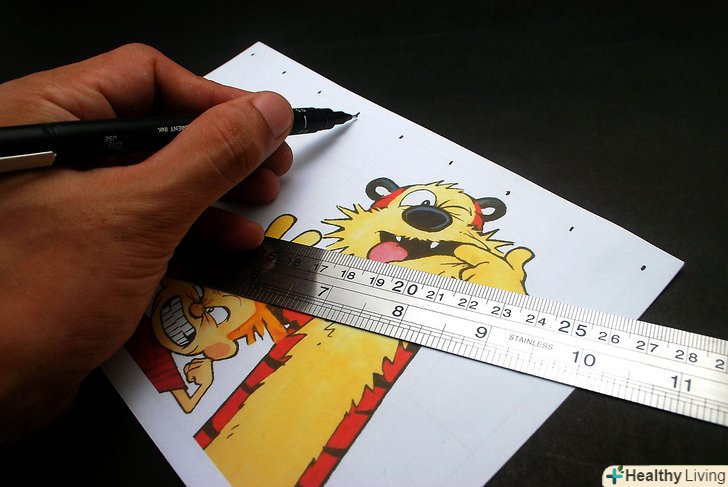 Зробіть на краях вихідного зображення позначки через рівні проміжки. для цього малюнка ви будете використовувати інтервали в 2,5 см.зрештою, у вас повинні вийти рівномірно розподілені позначки по краях паперу.- Якщо ви використовували інтервали в 2,5 см, тоді зробіть позначки на відстані 1,4 см від краю на верхній або нижній частині малюнка, так як довжина (або висота, якщо перевернути приклад) дорівнює тільки 21.4 см.