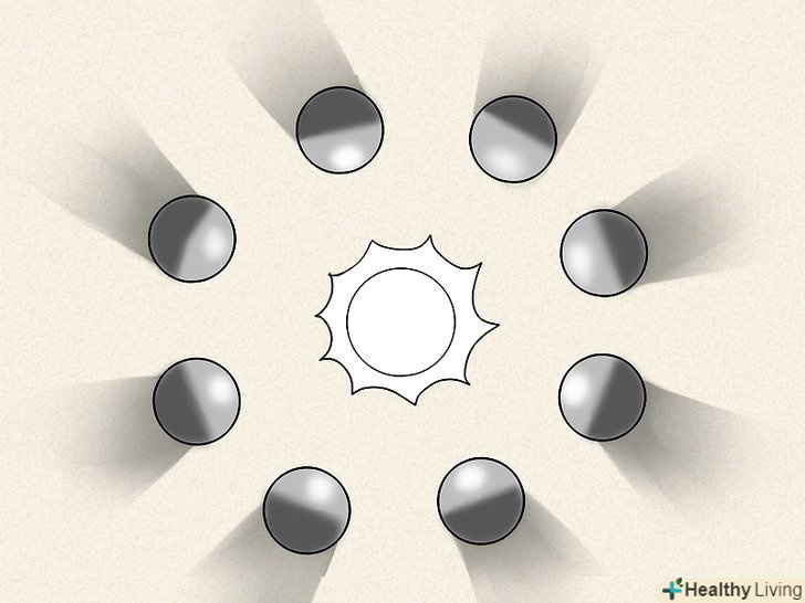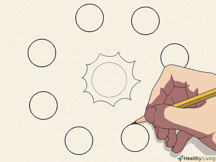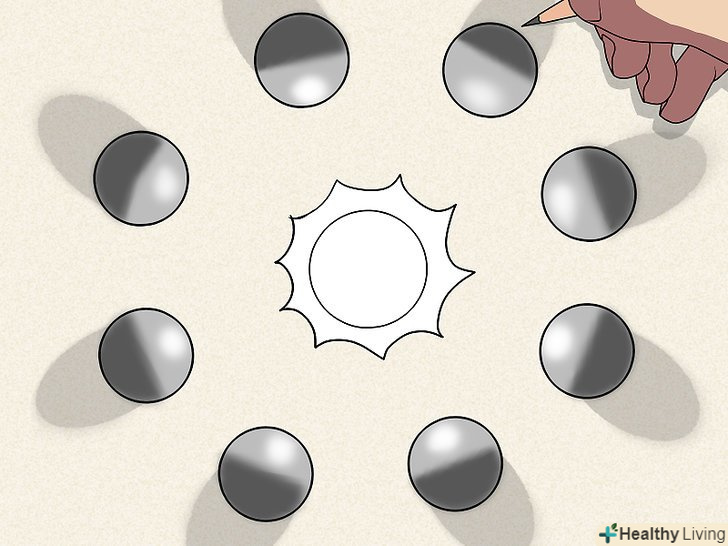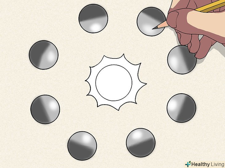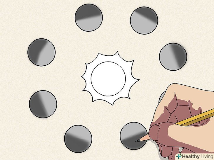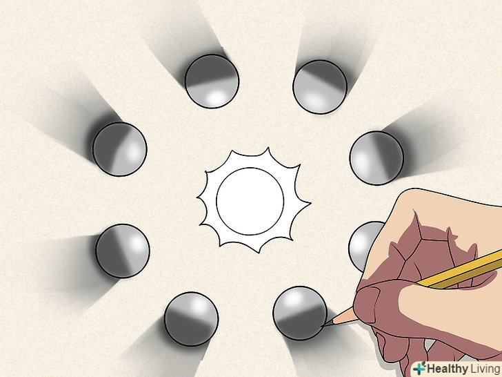 Намалюйте вісім кіл навколо уявної лампочки. це будуть об'єкти, що відкидають тінь. З їх допомогою ви побачите, як взаємне розташування джерела світла і освітлюваного об'єкта впливає на напрямок тіні. Намалюйте вісім кіл навколо уявної лампочки. це будуть об'єкти, що відкидають тінь. З їх допомогою ви побачите, як взаємне розташування джерела світла і освітлюваного об'єкта впливає на напрямок тіні.