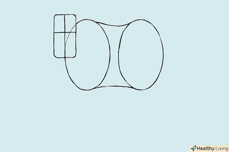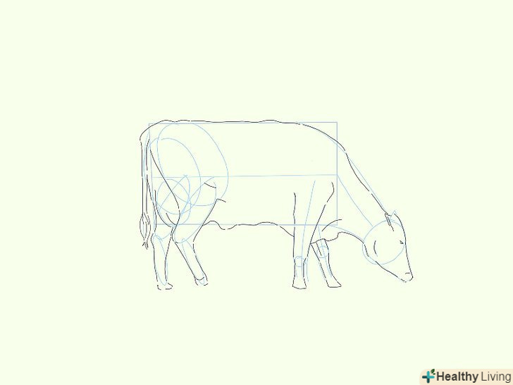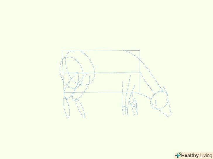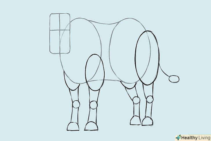 Зробіть начерк тіла корови. Вертикальним прямокутником з хрестом по центру позначте морду корови. Тіло обмежте двома вертикальними овалами і з'єднайте їх між собою увігнутими лініями. Зробіть начерк тіла корови. Вертикальним прямокутником з хрестом по центру позначте морду корови. Тіло обмежте двома вертикальними овалами і з'єднайте їх між собою увігнутими лініями.
