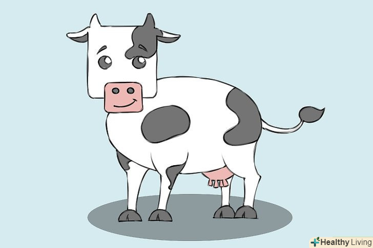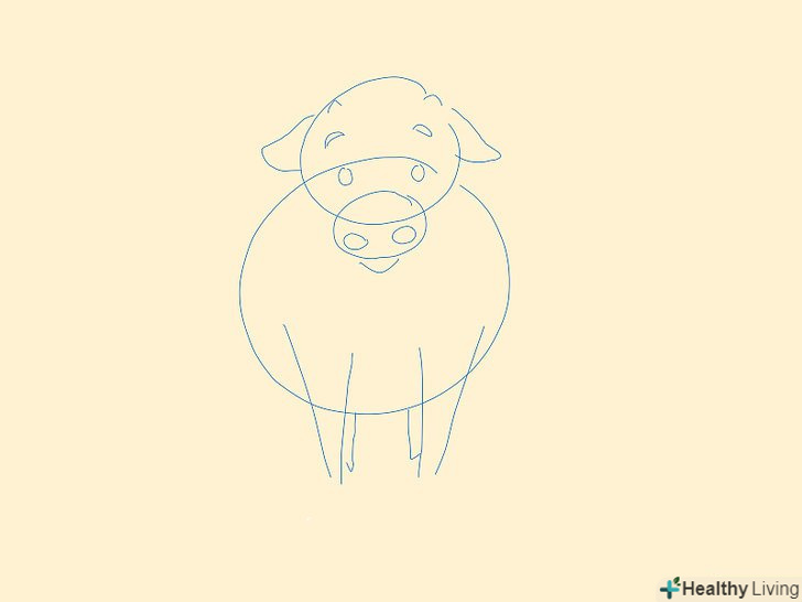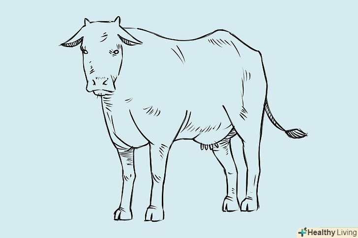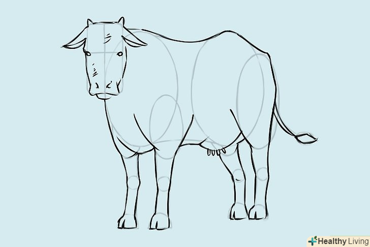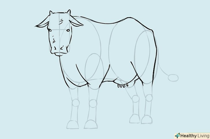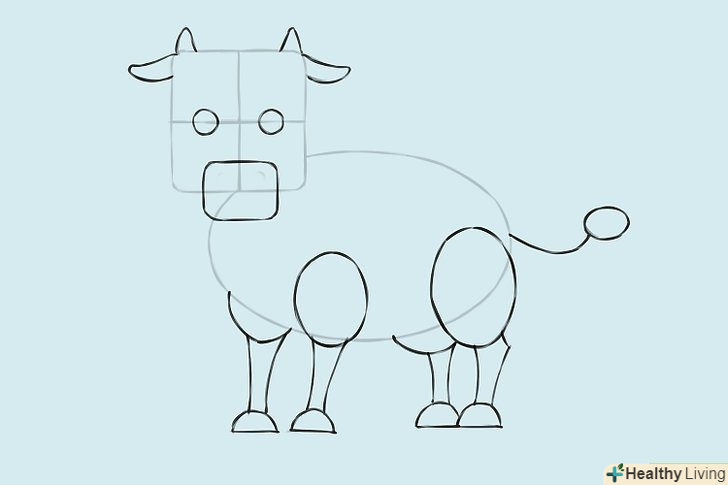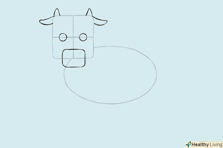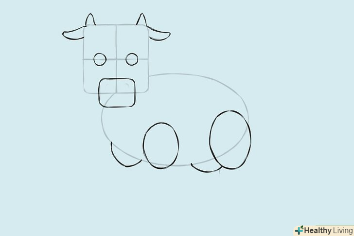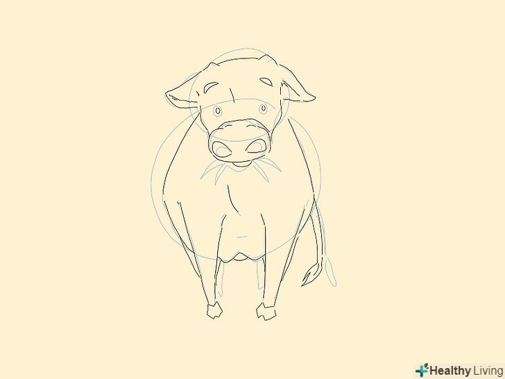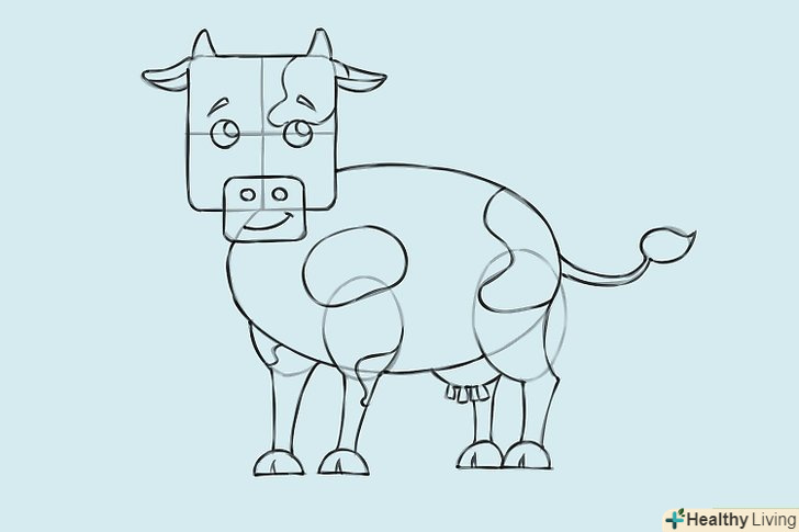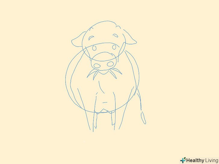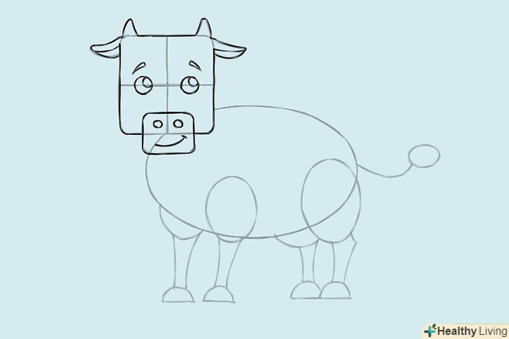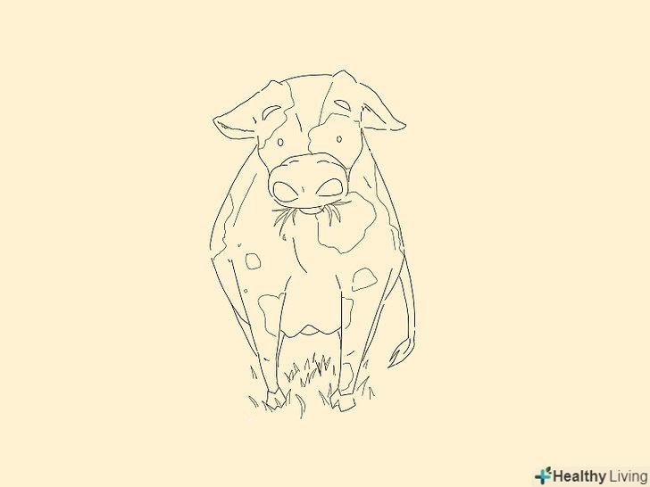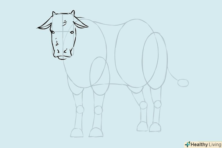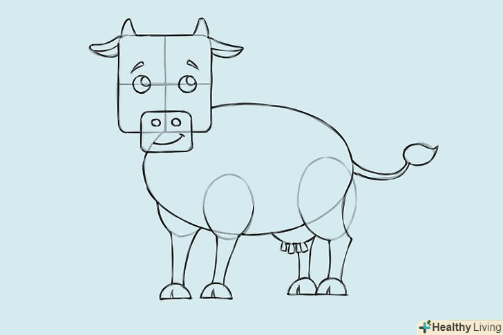 Прорисуйте деталі голови, додавши ніс, вуха, невеликі роги, очі і рот. можна навіть поекспериментувати з виразом морди корови. Вуха слід зробити опущеними вниз. Прорисуйте деталі голови, додавши ніс, вуха, невеликі роги, очі і рот. можна навіть поекспериментувати з виразом морди корови. Вуха слід зробити опущеними вниз.