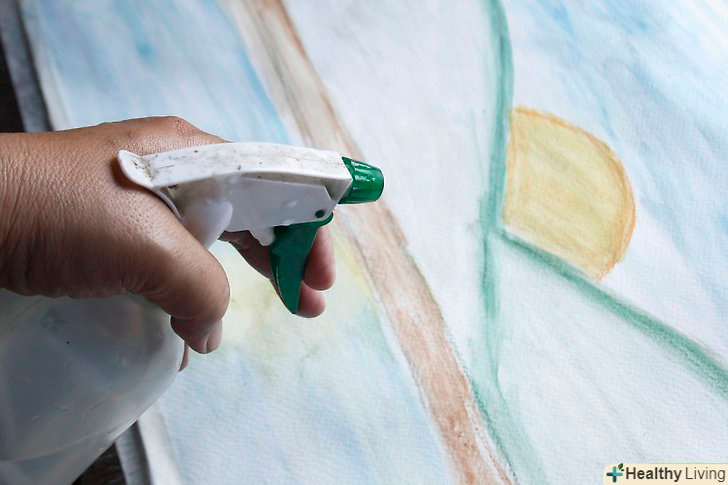 Побризкайте на малюнок водою. необхідно використовувати достатню кількість води, щоб кольори почали плавно переходити один в інший. Розбризкуйте воду не поспішаючи і акуратно, так як занадто велика кількість води за короткий час може розмити і повністю перемішати фарби. [14] Побризкайте на малюнок водою. необхідно використовувати достатню кількість води, щоб кольори почали плавно переходити один в інший. Розбризкуйте воду не поспішаючи і акуратно, так як занадто велика кількість води за короткий час може розмити і повністю перемішати фарби. [14]- Тримайте пульверизатор на зручній для Вас відстані від паперу. При цьому врахуйте, що, якщо відстань буде занадто маленьким, фарби помітно перемішаються, і малюнок втратить дрібні деталі. Чим далі ви будете тримати пляшку, тим менше перемішаються фарби і більш детальним буде малюнок.