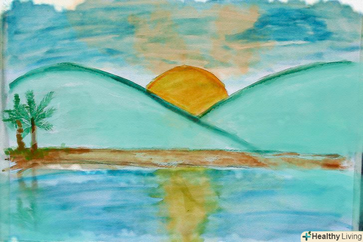 Перш ніж приступити до нанесення другого шару фарби, почекайте, поки висохне перший. щоб створити ще більш виразний акварельний ефект, можна нанести шар на воду. Зачекайте, поки вода повністю висохне, перш ніж наносити другий шар. Обережно перевіряйте папір кінчиком пальця-вона повинна бути сухою на дотик. Перевіряйте фарбу приблизно кожні п'ять хвилин. [8] Перш ніж приступити до нанесення другого шару фарби, почекайте, поки висохне перший. щоб створити ще більш виразний акварельний ефект, можна нанести шар на воду. Зачекайте, поки вода повністю висохне, перш ніж наносити другий шар. Обережно перевіряйте папір кінчиком пальця-вона повинна бути сухою на дотик. Перевіряйте фарбу приблизно кожні п'ять хвилин. [8]- Час, за який шари висохнуть, залежить від кількості нанесеної води і площі змоченої ділянки.