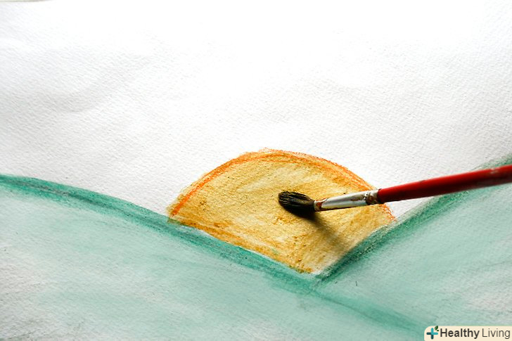 Нанесіть воду на розфарбований основними кольорами начерк. Величина кисті залежить від розмірів малюнка і того, якого ефекту ви хочете досягти. Для більш точного і деталізованого малюнка краще використовувати відносно тонкі кисті. Кисті товстіший додадуть малюнку більш абстрактний вигляд. Занурте кисть в невелику чашку з чистою водою, а потім акуратно витріть її об край чашки. [6] Нанесіть воду на розфарбований основними кольорами начерк. Величина кисті залежить від розмірів малюнка і того, якого ефекту ви хочете досягти. Для більш точного і деталізованого малюнка краще використовувати відносно тонкі кисті. Кисті товстіший додадуть малюнку більш абстрактний вигляд. Занурте кисть в невелику чашку з чистою водою, а потім акуратно витріть її об край чашки. [6]
