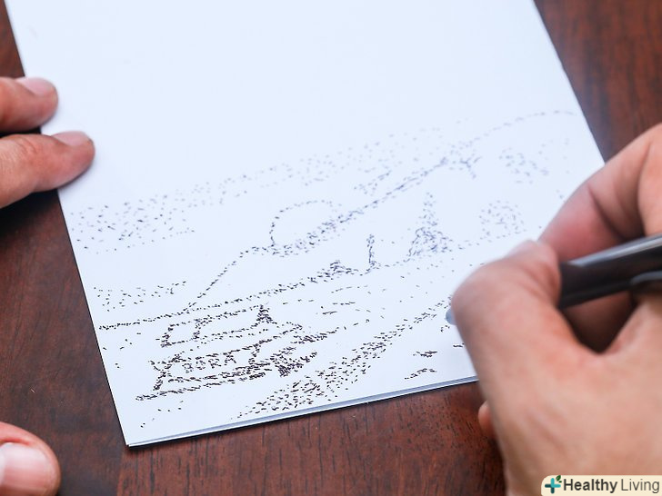 Почніть ставити крапки. обережно підніміть і натисніть ручкою (або іншим інструментом) на ваш аркуш паперу. Чим ближче ви намалюєте точки, тим темніше буде ця область на папері. Почніть з самого затемненого місця, а потім опрацюйте контур, заповнюючи всі темні області. Зрештою перейдіть до більш світлих місць, ставлячи точки далі один від одного. Коли ви робите малюнок точками, не забувайте:- Рівномірно розставляти точки. Хоча ви і можете малювати деякі точки близько один до одного, а інші далеко один від одного, остаточна робота буде виглядати набагато красивіше, якщо точки будуть розташовані рівномірно.