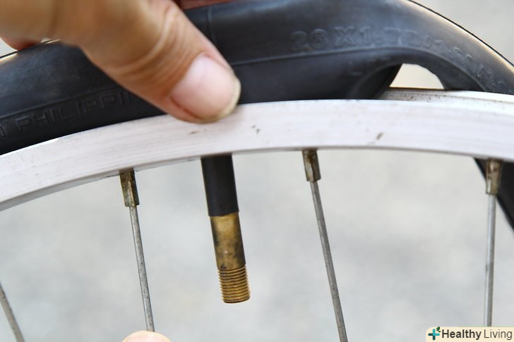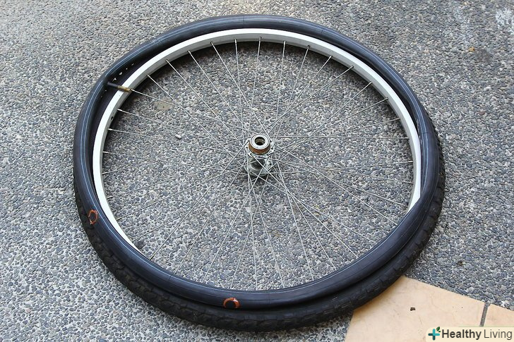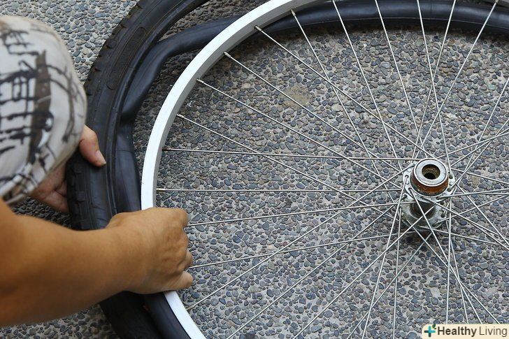 Заправте шину і камеру назад в обід колеса.далі, за допомогою великих пальців заправте шину (з частково накачаною камерою) назад в обід. Натисніть на зовнішній край шини, щоб вона зайшла за край металевого обода і зафіксувалася. Обережно, не прищеміть камеру між шиною і ободом. Щоб заправити останню частину шини вам можуть знадобитися монтажка або інший інструмент, оскільки іноді це буває не так вже й легко.- Зверніть увагу, що деякі висококласні шини призначені для обертання в одному конкретному напрямку. В такому випадку, передбачуваний напрямок обертання буде позначено невеликими стрілками на бортах шини. Не встановлюйте шину в зворотному напрямку! Інакше знизяться експлуатаційні якості шини, і збільшиться її знос.