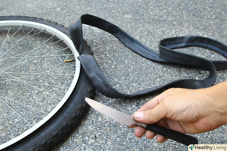 За допомогою монтажек зніміть шину.після того як знімете пробите колесо, зніміть зовнішню шину. У цій справі вам стати в нагоді міцний важіль. У деяких веломагазинах продаються спеціальні невеликі інструменти-монтажки. Якщо ви використовуєте монтажки або інші інструменти, знімаючи шину, будьте обережні і не затисніть камеру, пошкодивши її ще сильніше. Можна не знімати шину з обода повністю, залишивши один край шини на ободі, щоб полегшити собі зворотну збірку по закінченню роботи.- Якщо бути точним, то для цього завдання вам не потрібні саме монтажки. Підійде будь-який досить міцний інструмент, який послужить важелем. Для цієї роботи згодяться навіть вельми незвичайні рішення, наприклад викрутки або Ножі для масла.[1]