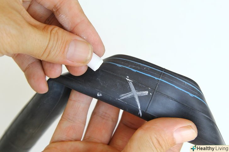 Позначте прокол у камері.проколи можуть бути напрочуд крихітними. Якщо вже Ви знайшли прокол - не втратьте його! Крейдою намалюйте хрестик з центром в місці проколу. Якщо ви будете заклеювати дірку-зробіть позначку досить великий, щоб її було видно після того, як ви завдасте клей.- Якщо крейди у вашому ремкомплекті немає, підійде ручка або інший пишучий прилад. Але крейда краще, оскільки білий колір на чорній гумі, звичайно ж, трохи помітніше, ніж синя або чорна ручка.