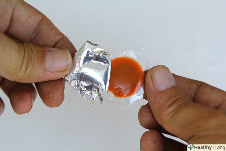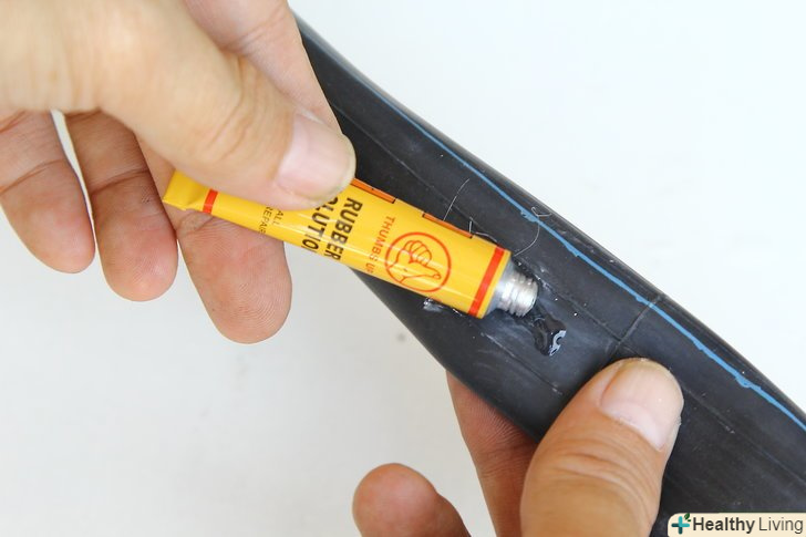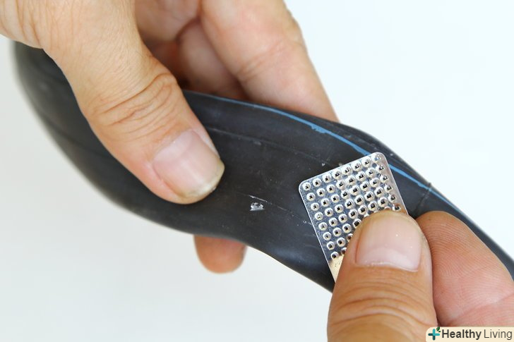 Застосуйте латку.далі, прикладіть латку поверх проколу згідно з інструкцією, що додається до ремкомплекту. Для деяких латок обов'язково потрібно клей, деякі є самоклеючими. Другий варіант зручніше, але вважається менш надійним. Базові принципи застосування обох видів латок наведені нижче. Якщо інструкція до Вашого ремкомплекту відрізняється від даних вказівок-дотримуйтесь інструкції.- Латки, які клеяться за допомогою клею: нанесіть клей (краще гумовий) на область камери навколо проколу, почекайте поки клей не схопитися (як правило, клей повинен підсохнути, не бути липким, подивіться інструкцію до клею). І, нарешті, помістіть латку на підсохлий клей і щільно притисніть на кілька хвилин, поки вона не приклеїться, заклавши прокол.