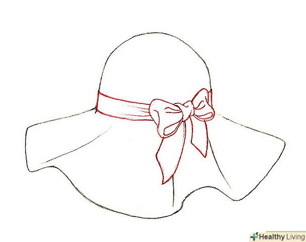 Намалюйте стрічку і бантик на правій частині капелюхи. спочатку намалюйте дві прямі лінії трохи вище полів капелюха. Потім намалюйте коло і два трикутника — це буде основа для бантика. Додайте трохи вигинів і складок, щоб стрічка виглядала природно.