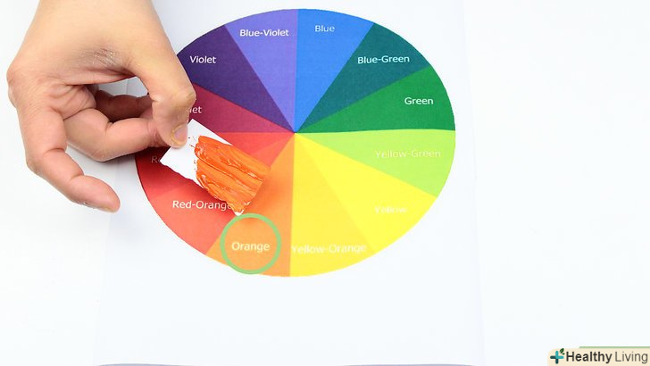 Знайдіть на колірному колі точний відтінок наявного у вас синього. щоб підібрати колір, що доповнює вашу синю фарбу, вам необхідно спочатку знайти її точне місце на колірному колі. Не варто орієнтуватися на назву фарби. Замість цього нанесіть трохи фарби на шматочок білого паперу і дайте їй висохнути. Зіставте ваш зразок з колірним колом і постарайтеся знайти точну відповідність. [6]