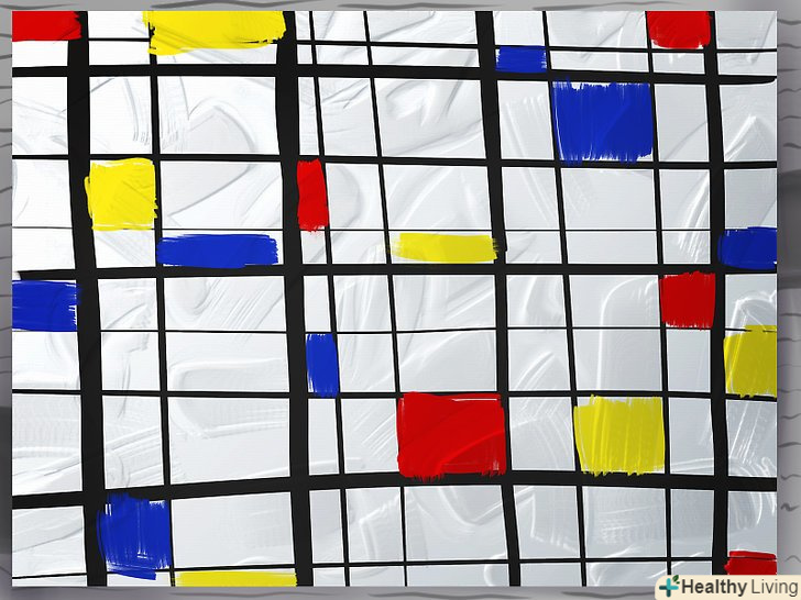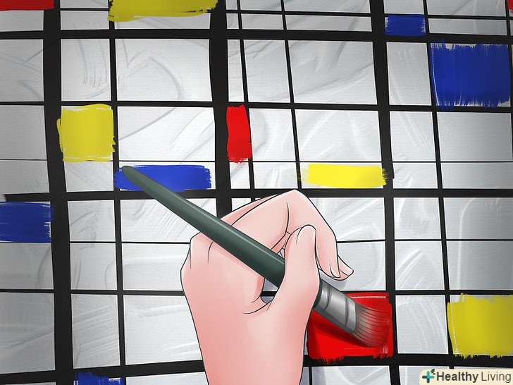 Зафарбуйте кілька квадратів і прямокутників. заповніть фігури фарбою первинних кольорів (червоний, синій, жовтий). Можна зафарбувати всі фігури, але так ваша картина буде виглядати занадто строкатою. Краще вибрати кілька фігур і зафарбувати тільки їх - так вони будуть більше виділятися на тлі.