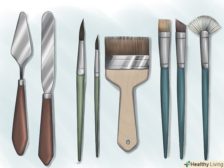 Підберіть кисті та інші інструменти. вибирайте будь-які кисті, з якими ви зможете працювати. Щоб додати картині фактурності, можна користуватися спеціальним ножем для нанесення фарби. Багато художників працюють з мольбертом, однак абстракціоністи часто вважають за краще класти полотно на підлогу, щоб бути ближче до своєї роботи. [2]- Якщо ви не впевнені, як будуть поєднуватися кольори, купіть колірний круг. Він допоможе вам розібратися в тому, які кольори добре виглядають разом.