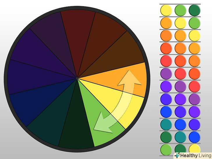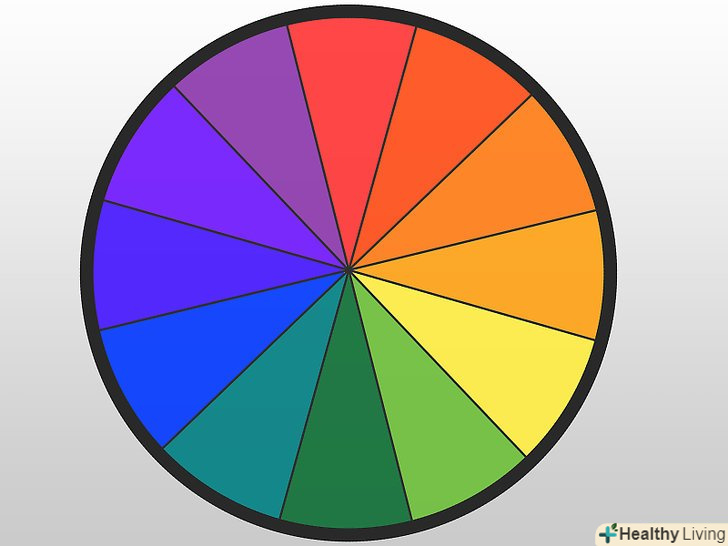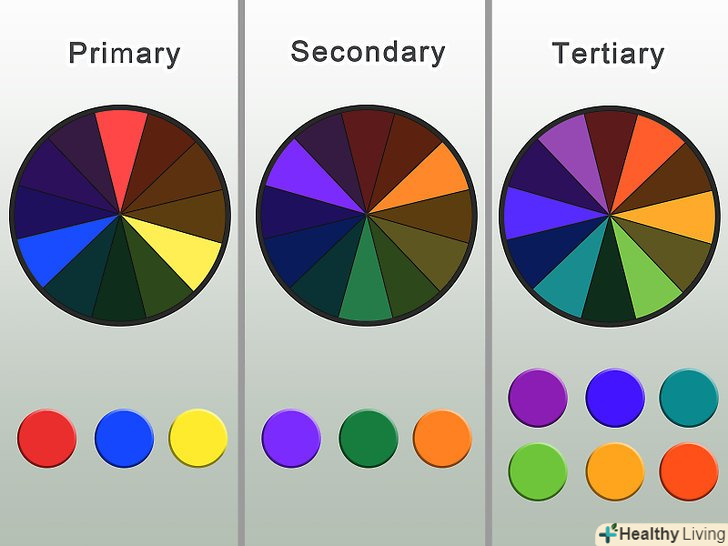 Навчіться розрізняти первинні, вторинні та третинні кольори. колірний круг розділений на три частини. Первинні кольори-це червоний, синій, жовтий. Вторинні кольори виходять в результаті змішування первинних: зелений, помаранчевий, бузковий. Третинні кольори-результат змішання первинних і вторинних кольорів: жовтого з помаранчевим, червоного з помаранчевим, червоного з бузковим, синього з бузковим, синього з зеленим і жовтого з зеленим. [4]- Щоб краще зрозуміти, як з'являються кольори, спробуйте зробити свій власний колірний круг.