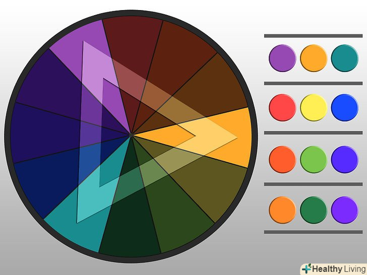 - Тріадичні кольори. Виберіть три кольори, які розташовуються на однаковій відстані один від одного. Проведіть лінію між цими кольорами, і ви повинні отримати трикутник. Ці кольори будуть контрастувати.