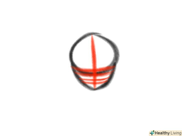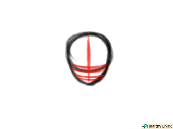 Накидайте лінії розташування деталей особи. намалюйте чотири горизонтальні та одну вертикальну лінію. З їх допомогою ви зможете промальовувати брови, очі, ніс і рот.