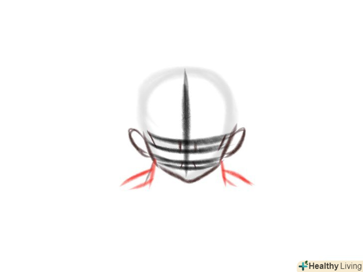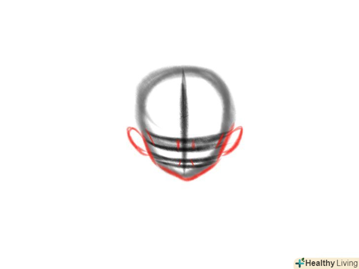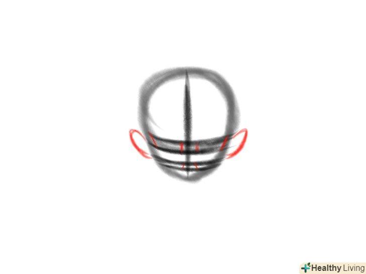 Намалюйте вуха і уточніть начерк особи. необхідно домалювати шість скошених рисок на раніше зроблених напрямних лініях особи. Вони будуть більш точно вказувати на розташування елементів особи. Лінії вух повинні бути на рівні з напрямними лініями брів, очей і носа.