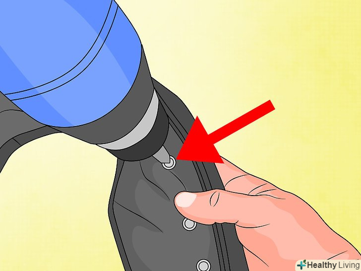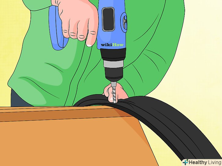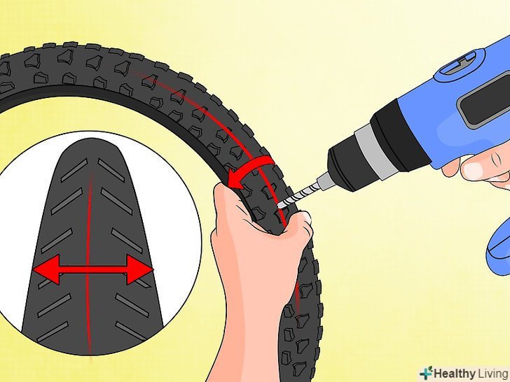 Вкрутіть зсередини саморіз.якщо отвір вийшло не перпендикулярним покришці, саморіз буде стирчати в сторону.- Робіть отвір і відразу вкручуйте саморіз. Якщо ви спочатку насвердлите отворів, щоб потім вкрутити саморізи – отвори буде дуже складно знайти.