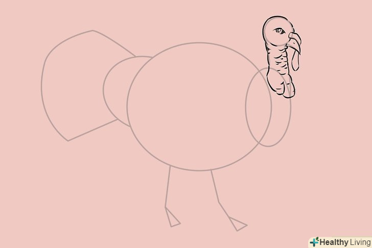 Намалюйте тулуб і ноги індички на основі свого контуру. додайте кілька кривих ліній, що формують воріт трохи нижче шиї для зображення пір'я.